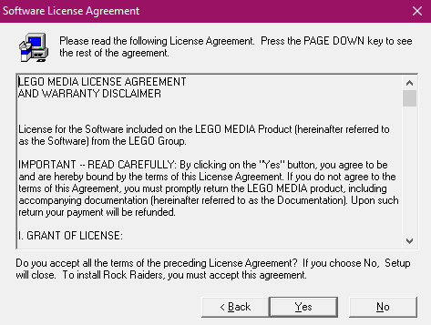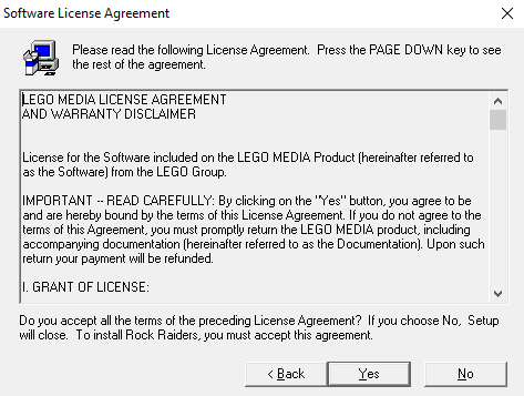 Description | A screenshot of the LEGO Rock Raiders setup program, showing the Software License Agreement screen. |