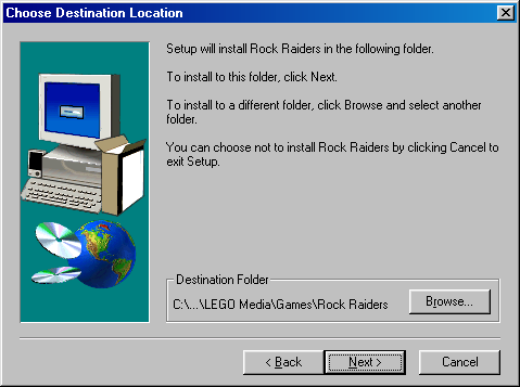 Description A screenshot of the LEGO Rock Raiders setup program, showing the Choose Destination Location screen.