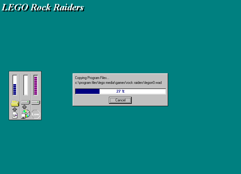 Description | A screenshot of the LEGO Rock Raiders setup program, showing the game's files copying from the CD to the hard disk. |