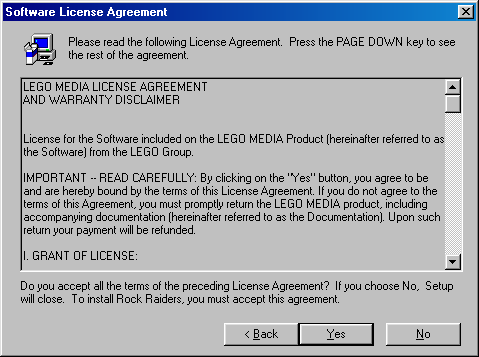Description | A screenshot of the LEGO Rock Raiders setup program, showing the Software License Agreement screen. |