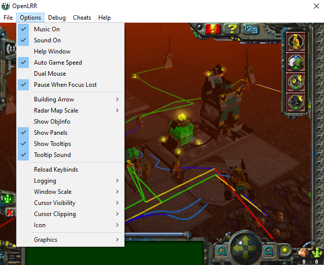 | Description | A screenshot of LEGO Rock Raiders running with OpenLRR. The screenshot shows OpenLRR features such as the added menus and some gameplay options enabled, including top-down fog and routing paths. |